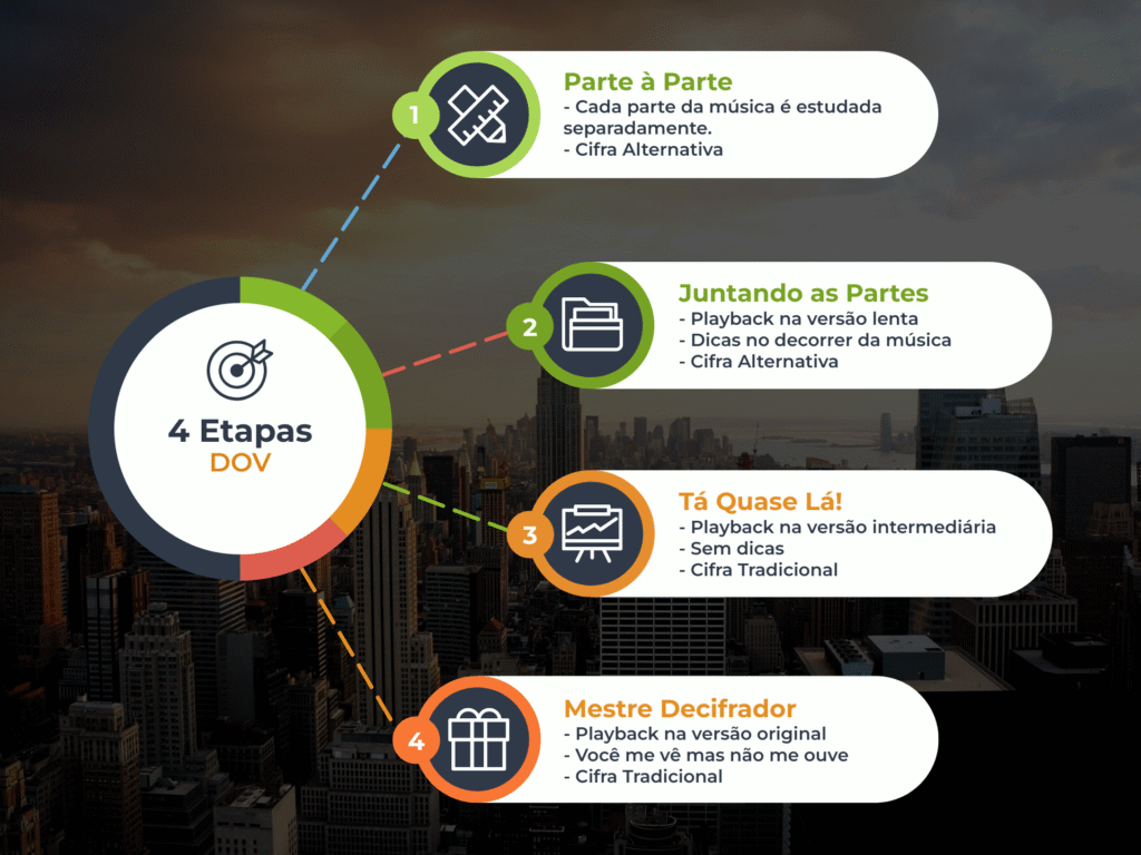 Cada música que você aprende segue um passo a passo simples, dividido em 4 etapas.