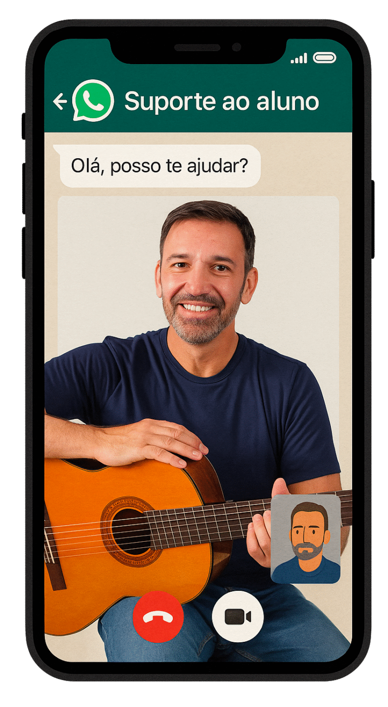 É como ter um professor de violão no bolso — pronto pra te responder, te orientar e te dar aquele empurrãozinho quando bater a dúvida ou o desânimo.